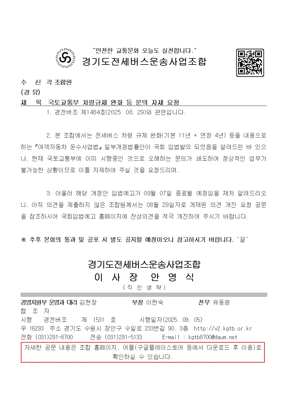 국토교통부 차령규제 완화 등 문의 자제 요청 페이지 정보 작성자 운영자 조회 853회 작성일 2025-09-05 02:35:34 목록 본문 다운로드 : 국토교통부 차령규제 완화 등 문의 자제 요청.pdf 다운로드 : 국토교통부 차령규제 완화 등 문의 자제 요청.hwp 이전글공무원 사칭 운송용역계약 알선 사기 피해 주의 안내 2025-09-05 다음글가을 행락철 전세버스 안전운행 관리 철저 요청 2025-09-23