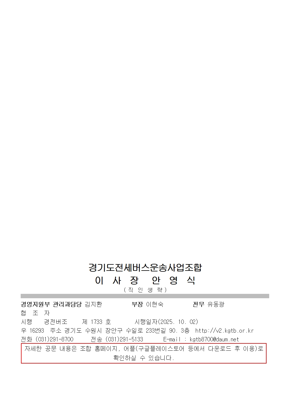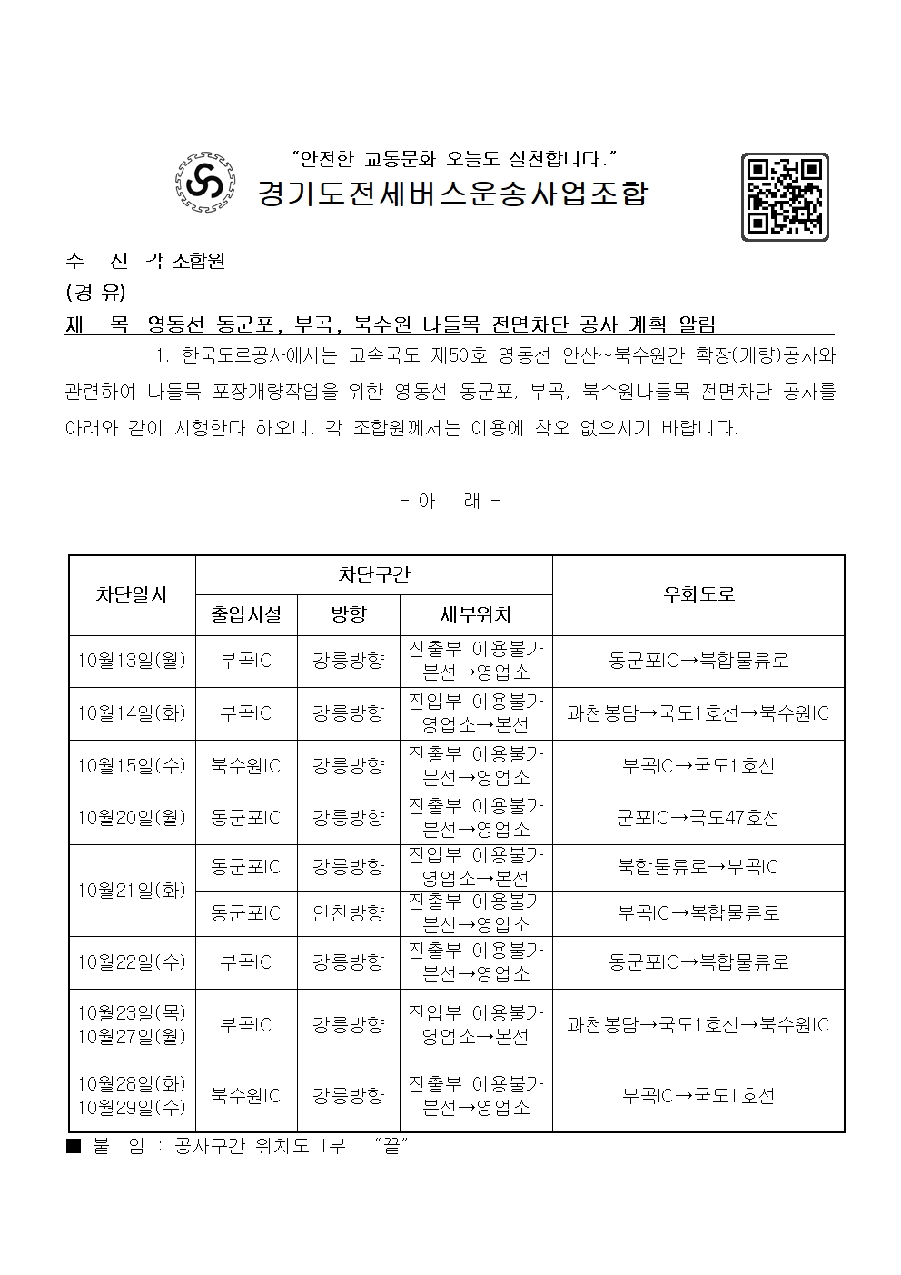 영동선 동군포, 부곡, 북수원 나들목 전면차단 공사 계획 알림 페이지 정보 작성자 운영자 조회 661회 작성일 2025-10-02 04:36:12 목록 본문 다운로드 : 영동선 동군포, 부곡, 북수원 나들목 전면차단 공사 계획 알림.hwp 다운로드 : 영동선 동군포, 부곡, 북수원 나들목 전면차단 공사 계획 알림.pdf 이전글2025년도 9월 운수종사자 휴식시간 보장내역 제출 및 준수 철저 2025-09-30 다음글공제 혁신을 위한 권역별 센터화 등 조직개편 시행 알림 2025-10-14