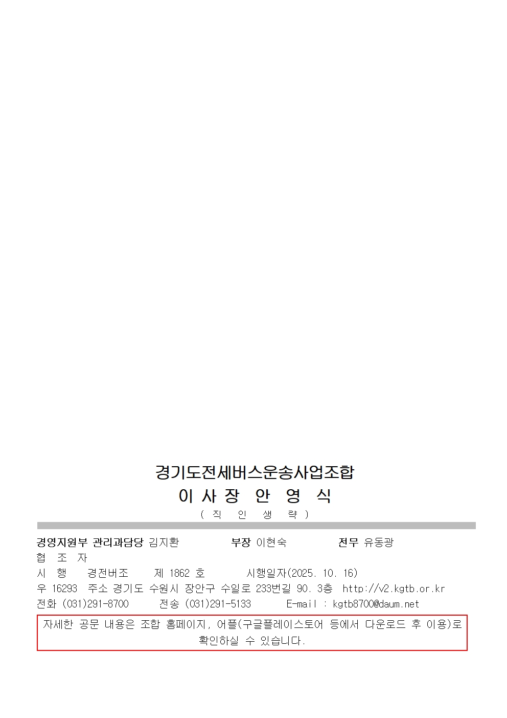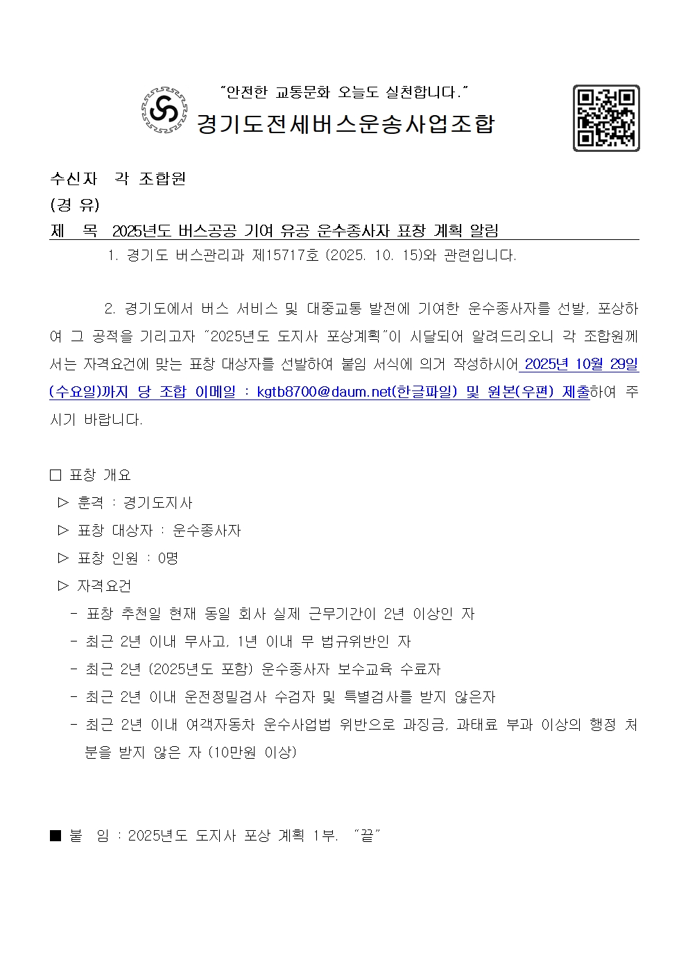 2025년도 버스공공 기여 유공 운수종사자 표창 계획 알림 페이지 정보 작성자 운영자 조회 544회 작성일 2025-10-16 04:08:54 목록 본문 다운로드 : 2025년도 버스공공 기여유공 운수종사자 표창 계획알림.hwp 다운로드 : 2025년도 버스공공 기여유공 운수종사자 표창 계획알림.pdf 이전글공제 혁신을 위한 권역별 센터화 등 조직개편 시행 알림 2025-10-14 다음글차내 안내방송 실시 및 영상기록장치의 운영 관리 철저 요청 2025-10-17