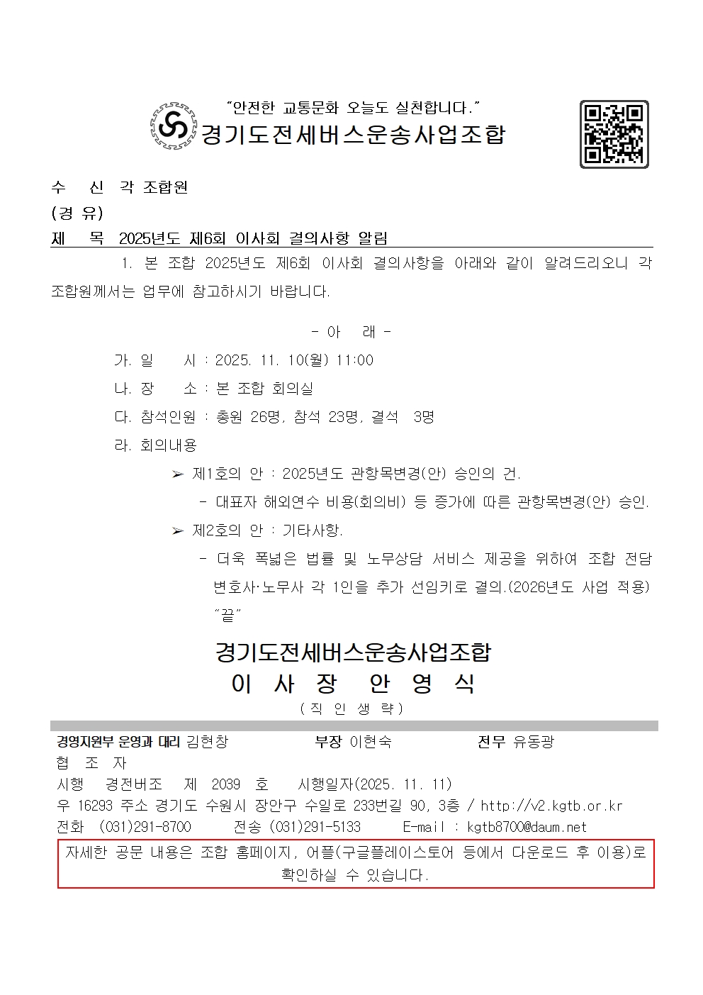 2025년도 제6회 이사회 결의사항 알림 페이지 정보 작성자 운영자 조회 592회 작성일 2025-11-11 01:18:18 목록 본문 다운로드 : 2025년도 제6회 이사회 결의사항 알림.pdf 다운로드 : 2025년도 제6회 이사회 결의사항 알림.hwp 이전글송도 포스코그룹 BUS-POOL 통근버스 입찰 참여 업체 추천에 따른 변경사항 알림 2025-11-04 다음글2025년도 대표자 해외연수 세부일정 알림 2025-11-13