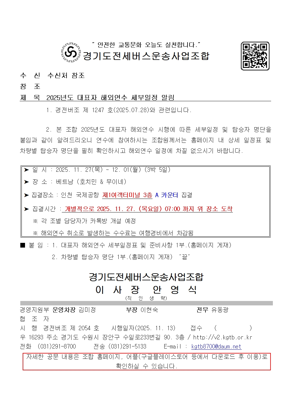 2025년도 대표자 해외연수 세부일정 알림 페이지 정보 작성자 운영자 조회 1013회 작성일 2025-11-13 02:22:45 목록 본문 다운로드 : 2025년도 대표자 해외연수 세부일정 알림.hwp 다운로드 : 2025년도 대표자 해외연수 세부일정 알림.pdf 이전글2025년도 제6회 이사회 결의사항 알림 2025-11-11 다음글여객자동차 운수사업법 일부개정법률안 국회 본회의 통과 알림 2025-11-13