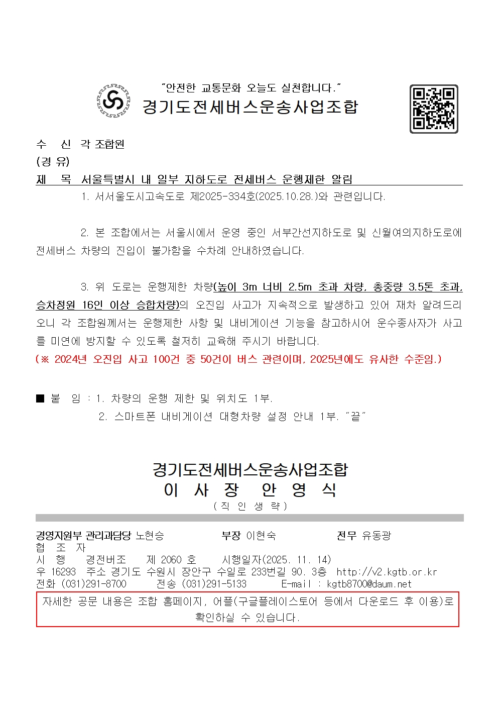 서울특별시 내 일부 지하도로 전세버스 운행제한 알림 페이지 정보 작성자 운영자 조회 629회 작성일 2025-11-14 09:52:18 목록 본문 다운로드 : 서울특별시 내 일부 지하도로 전세버스 운행제한 알림..hwp 다운로드 : 서울특별시 내 일부 지하도로 전세버스 운행제한 알림.pdf 이전글겨울철 교통사고 예방을 위한 안전관리 철저 요청 2025-11-14 다음글2025년도 운수종사자 보수교육 추가 일정 알림 2025-11-17