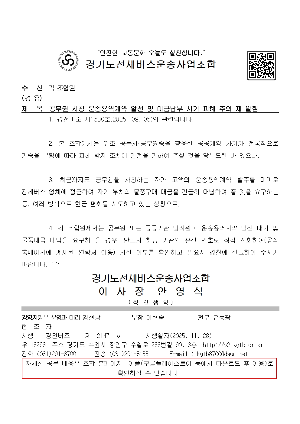공무원 사칭 운송용역계약 알선 및 대금납부 사기 피해 주의 재 알림 페이지 정보 작성자 운영자 조회 350회 작성일 2025-11-28 03:55:45 목록 본문 다운로드 : 공무원 사칭 운송용역계약 알선 및 대금납부 사기 피해 주의 재 알림.pdf 다운로드 : 공무원 사칭 운송용역계약 알선 및 대금납부 사기 피해 주의 재 알림.hwp 이전글2025년도 운수종사자 보수교육 추가 일정 알림 2025-11-17 다음글2025년도 11월 운수종사자 휴식시간 보장내역 제출 및 준수 철저 2025-12-02