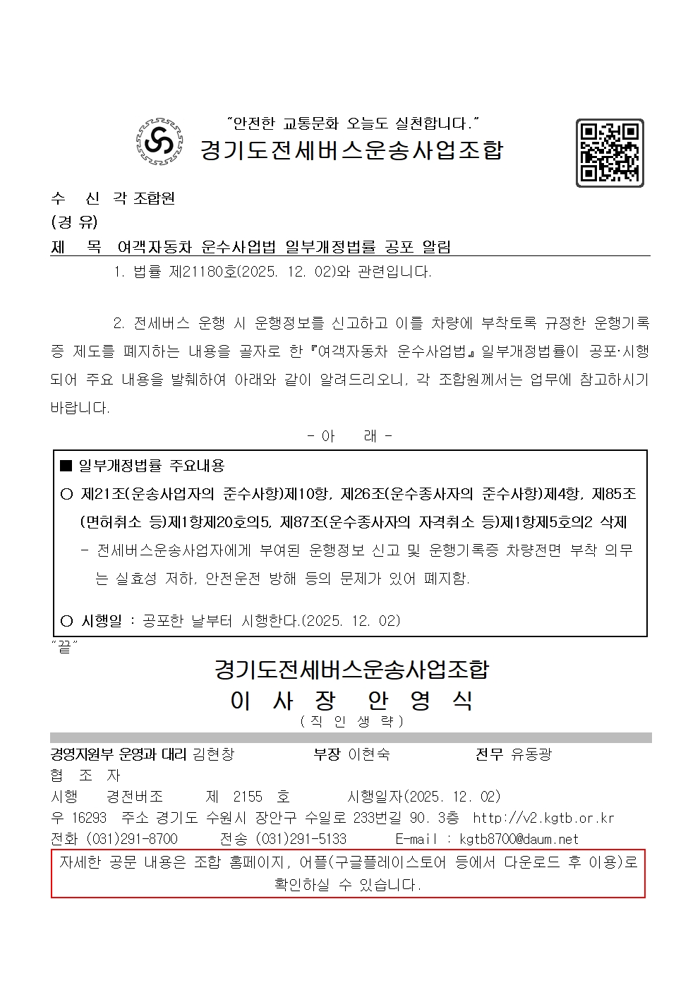 여객자동차 운수사업법 일부개정법률 공포 알림 페이지 정보 작성자 운영자 조회 2731회 작성일 2025-12-02 08:32:15 목록 본문 다운로드 : 여객자동차 운수사업법 일부개정법률 공포 알림12.02.hwp 다운로드 : 여객자동차 운수사업법 일부개정법률 공포 알림.pdf 이전글2025년도 11월 운수종사자 휴식시간 보장내역 제출 및 준수 철저 2025-12-02 다음글수도권 대설 예비특보에 따른 주의 및 피해 예방 철저 요청 2025-12-04