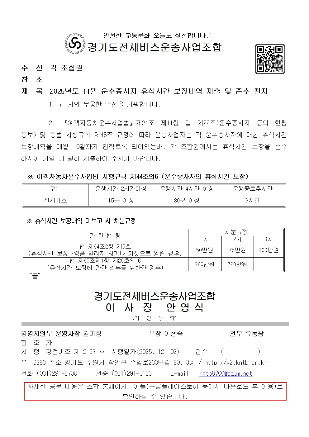 2025년도 11월 운수종사자 휴식시간 보장내역 제출 및 준수 철저 페이지 정보 작성자 운영자 조회 1594회 작성일 2025-12-02 01:47:08 목록 본문 다운로드 : 2025년도 11월 운수종사자 휴식시간 보장내역 제출 및 준수 철저.hwp 다운로드 : 2025년도 11월 운수종사자 휴식시간 보장내역 제출 및 준수 철저.pdf 이전글공무원 사칭 운송용역계약 알선 및 대금납부 사기 피해 주의 재 알림 2025-11-28 다음글여객자동차 운수사업법 일부개정법률 공포 알림 2025-12-02