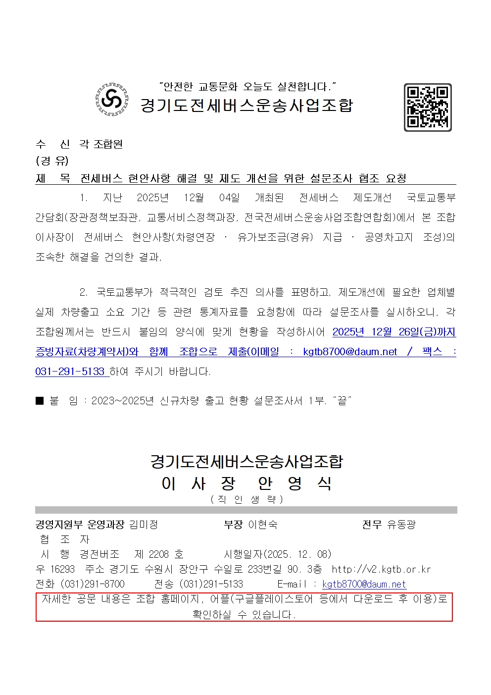 전세버스 현안사항 해결 및 제도 개선을 위한 설문조사 협조 요청 페이지 정보 작성자 운영자 조회 4820회 작성일 2025-12-08 04:42:55 목록 본문 다운로드 : 전세버스 현안사항 해결 및 제도 개선을 위한 설문조사 협조 요청.pdf 다운로드 : 전세버스 현안사항 해결 및 제도 개선을 위한 설문조사 협조 요청.hwp 이전글수도권 대설 예비특보에 따른 주의 및 피해 예방 철저 요청 2025-12-04 다음글사업용자동차 운전자 운전적성 정밀검사 관리규정 일부개정 고시 알림 2025-12-08