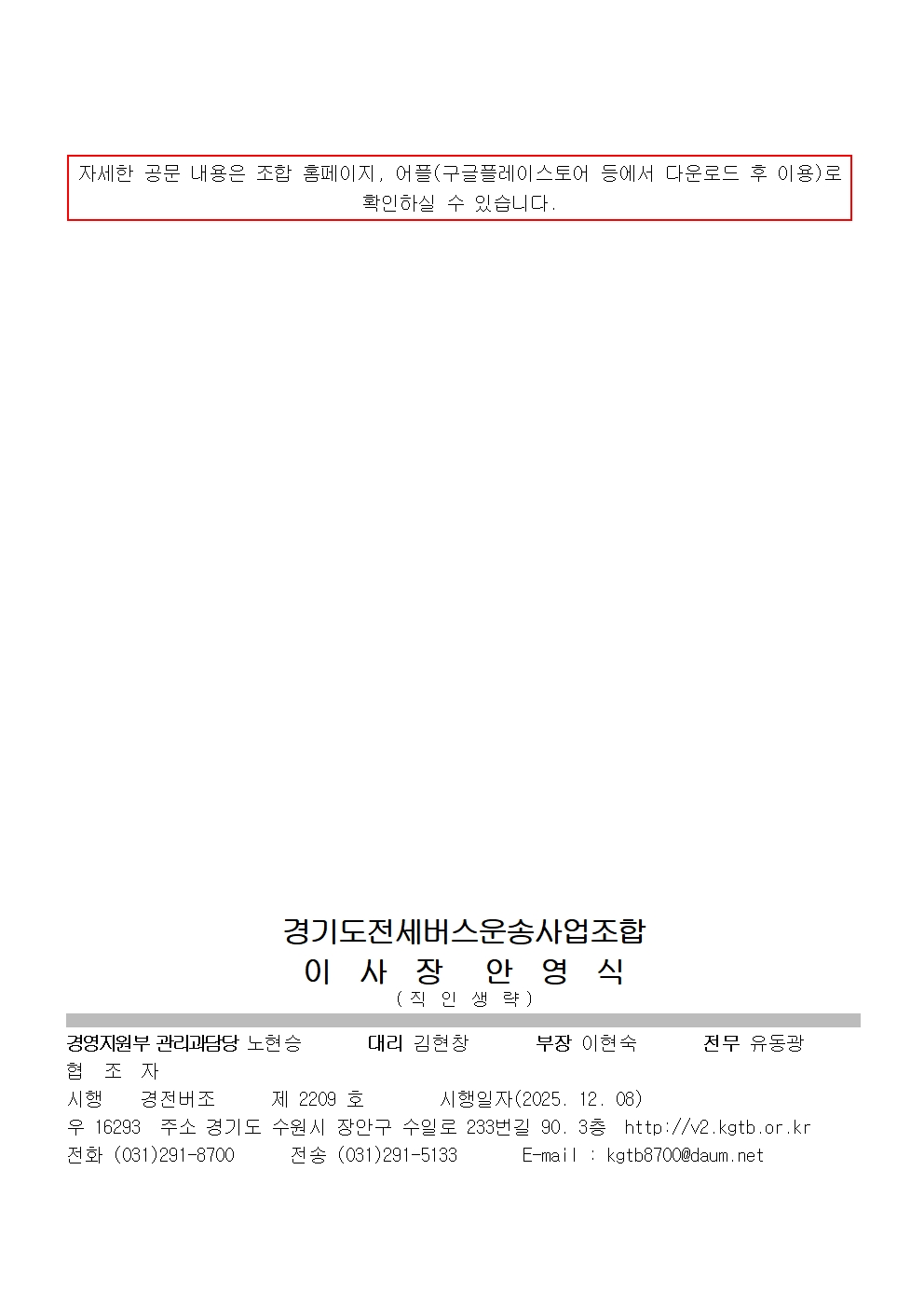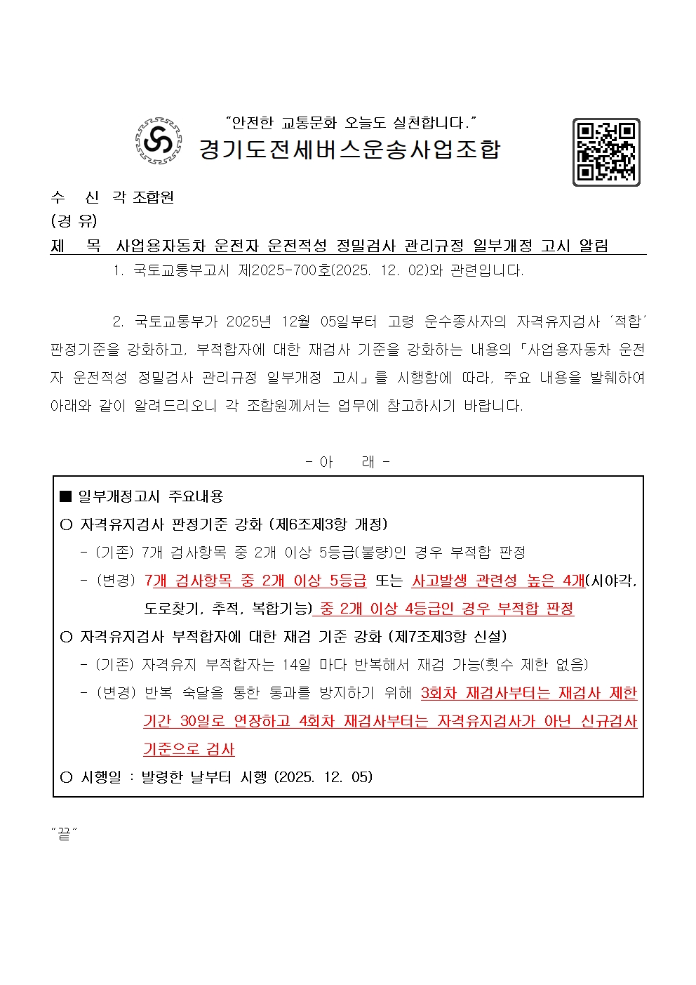 사업용자동차 운전자 운전적성 정밀검사 관리규정 일부개정 고시 알림 페이지 정보 작성자 운영자 조회 4592회 작성일 2025-12-08 04:46:03 목록 본문 다운로드 : 「사업용자동차 운전자 운전적성 정밀검사 관리규정 일부개정 고시」알림.pdf 다운로드 : 「사업용자동차 운전자 운전적성 정밀검사 관리규정 일부개정 고시」알림.hwp 이전글전세버스 현안사항 해결 및 제도 개선을 위한 설문조사 협조 요청 2025-12-08 다음글서울특별시 종로구 북촌 특별관리지역 인근 전세버스 승하차 조성 안내 2025-12-10