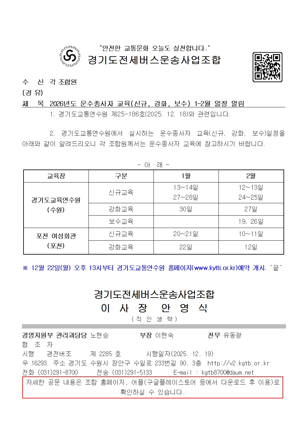 2026년도 운수종사자 교육(신규, 강화, 보수) 1~2월 일정 알림 페이지 정보 작성자 운영자 조회 479회 작성일 2025-12-19 09:47:01 목록 본문 다운로드 : 2026년도 운수종사자 교육신규, 강화, 보수 1~2월 일정 알림.pdf 다운로드 : 2026년도 운수종사자 교육신규, 강화, 보수 1~2월 일정 알림.hwp 이전글화성시 동탄권 버스전용차로 통행지정증 신청 안내 2025-12-17