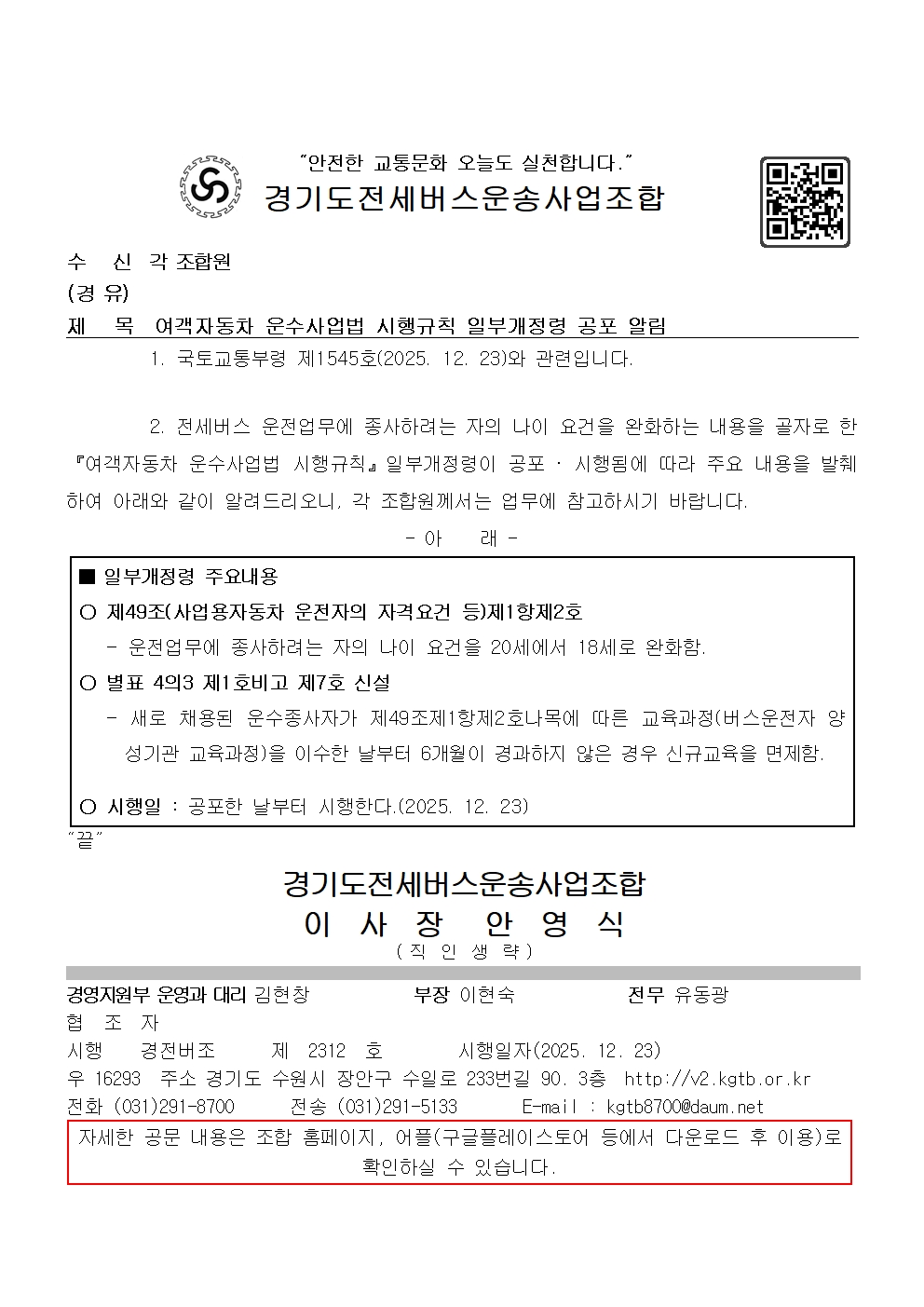 여객자동차 운수사업법 시행규칙 일부개정령 공포 알림 페이지 정보 작성자 운영자 조회 783회 작성일 2025-12-23 03:12:45 목록 본문 다운로드 : 여객자동차 운수사업법 시행규칙 일부개정령 공포 알림12.23.pdf 다운로드 : 여객자동차 운수사업법 시행규칙 일부개정령 공포 알림12.23.hwp 이전글2026년도 운수종사자 교육(신규, 강화, 보수) 1~2월 일정 알림 2025-12-19 다음글타이어 장착지점 일부 폐지 알림 2025-12-24