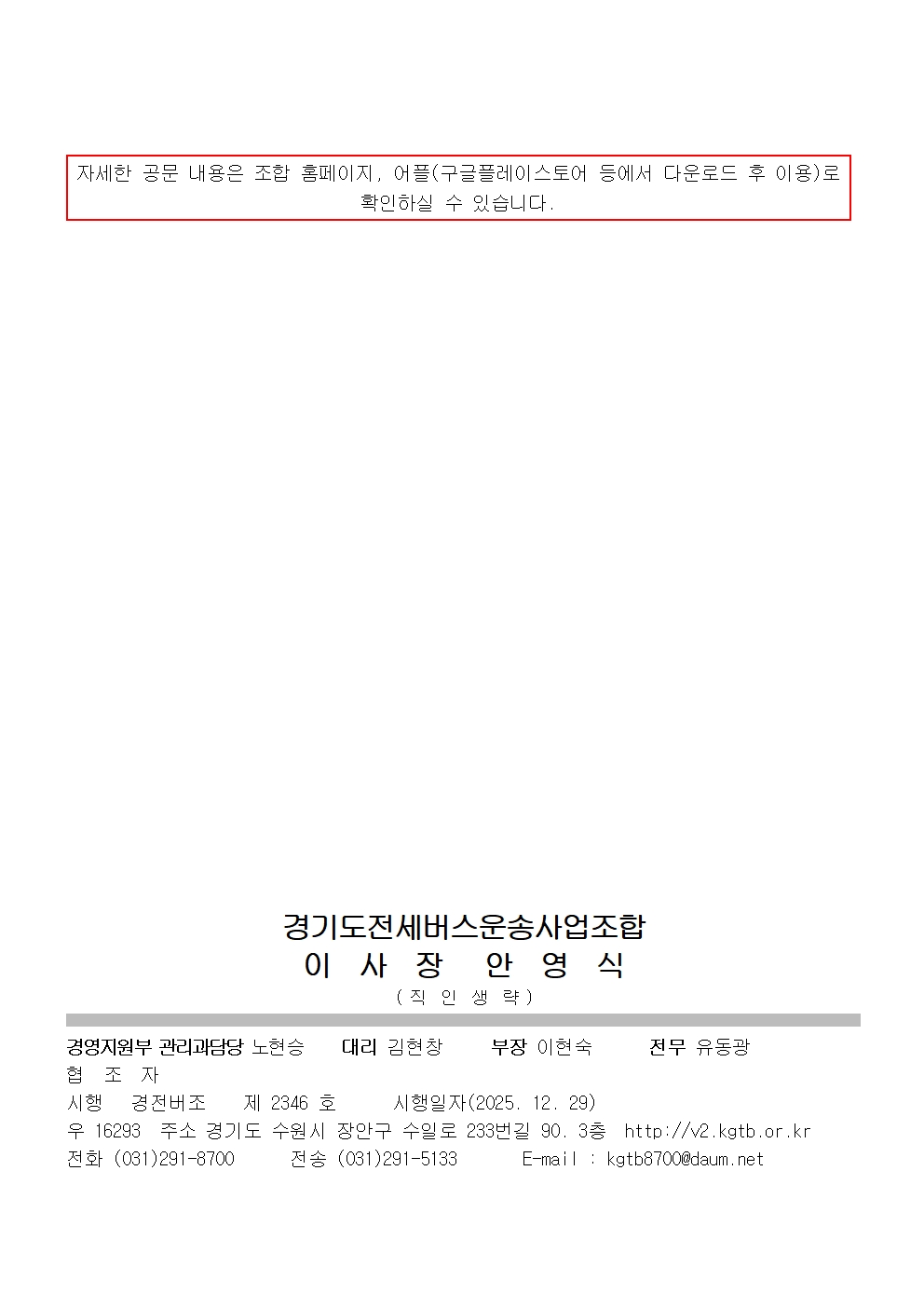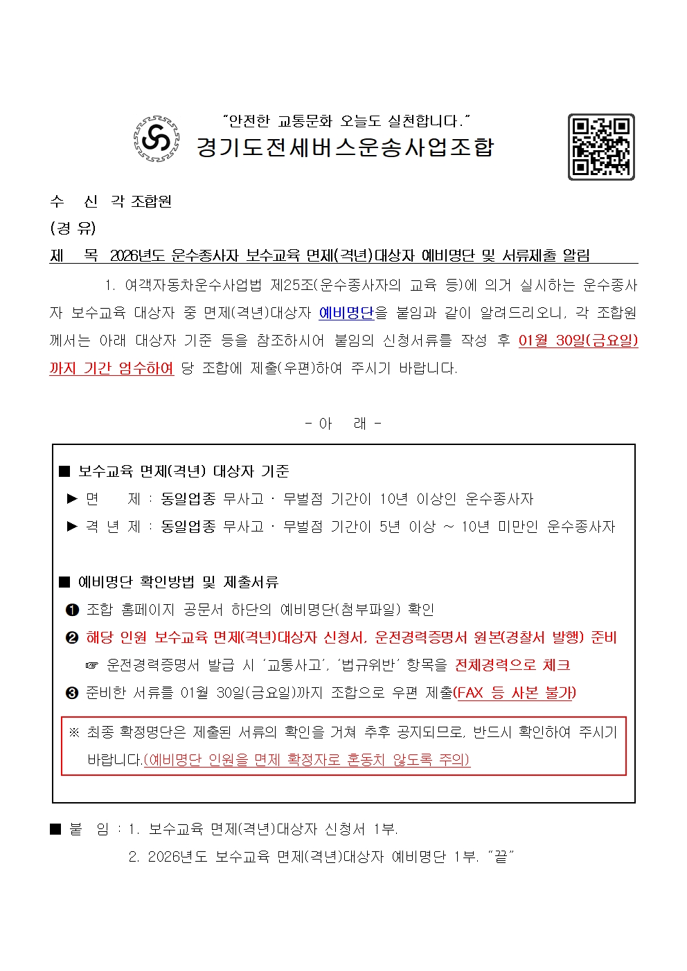 2026년도 운수종사자 보수교육 면제(격년)대상자 예비명단 및 서류제출 알림 페이지 정보 작성자 운영자 조회 1103회 작성일 2025-12-29 09:37:34 목록 본문 다운로드 : 2026년도 운수종사자 보수교육 면제격년대상자 예비명단 및 서류제출 알림.hwp 다운로드 : 2026년도 운수종사자 보수교육 면제격년대상자 예비명단 및 서류제출 알림.pdf 다운로드 : 2026년도 보수교육 면제격년대상자 예비명단.xlsx 이전글2026년도 업무용 다이어리 및 달력 송부 알림 2025-12-29 다음글2026년도 운수종사자 교육계획 알림 2025-12-31