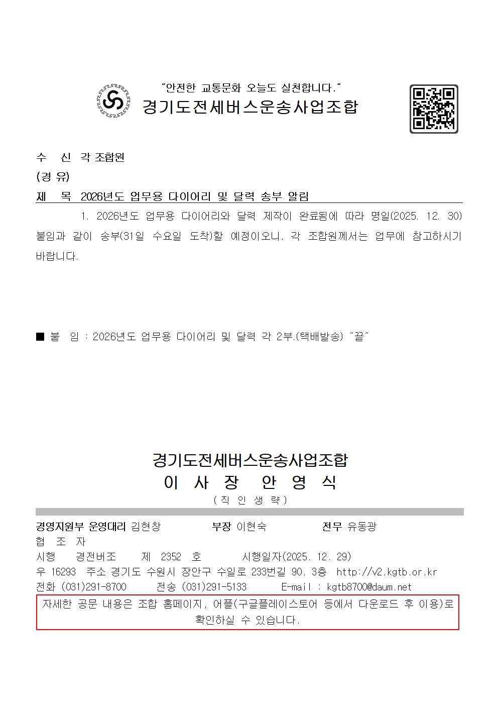 2026년도 업무용 다이어리 및 달력 송부 알림 페이지 정보 작성자 운영자 조회 501회 작성일 2025-12-29 01:36:25 목록 본문 다운로드 : 2026년도 업무용 다이어리 및 달력 송부 알림.pdf 다운로드 : 2026년도 업무용 다이어리 및 달력 송부 알림.hwp 이전글타이어 장착지점 일부 폐지 알림 2025-12-24 다음글2026년도 운수종사자 보수교육 면제(격년)대상자 예비명단 및 서류제출 알림 2025-12-29