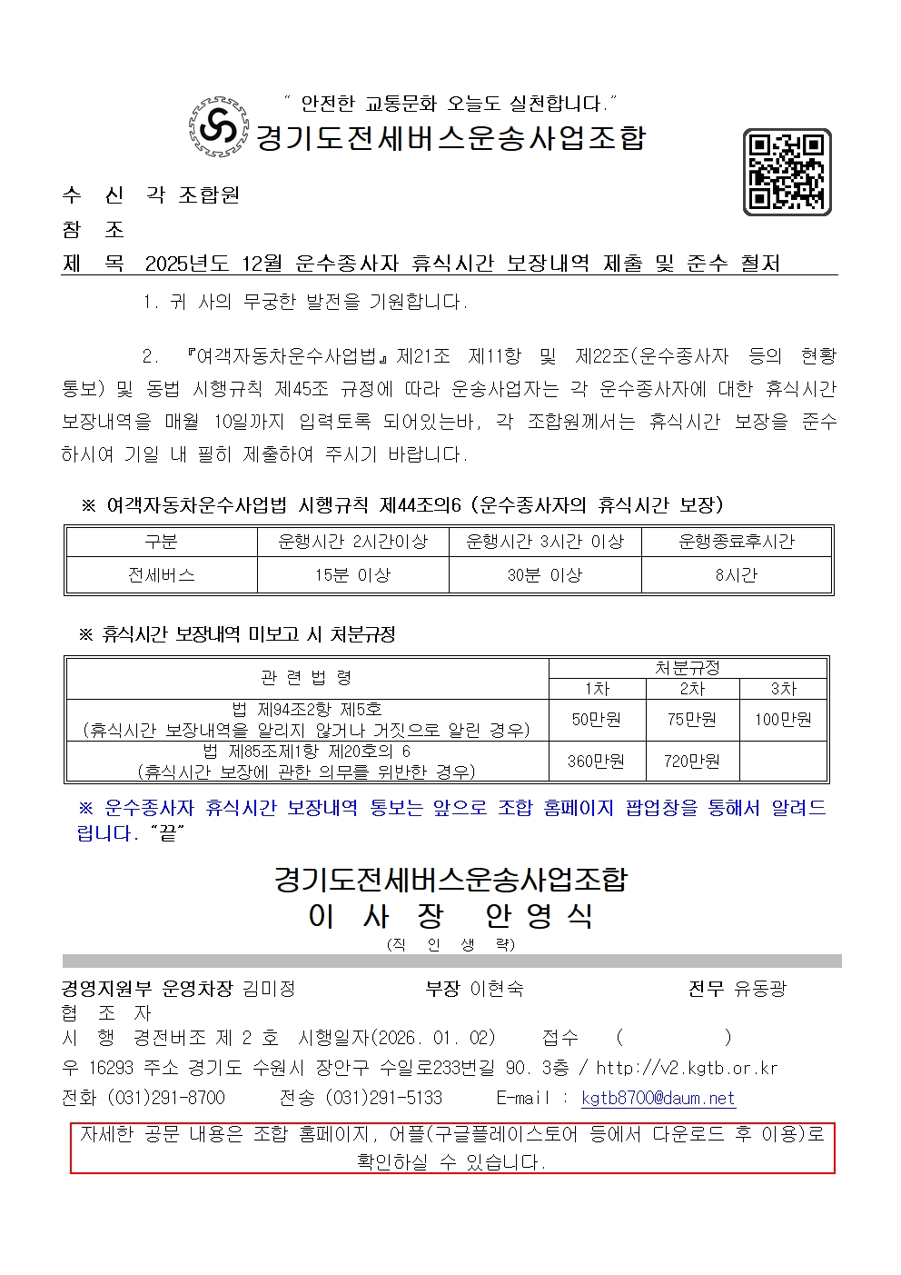 2025년도 12월 운수종사자 휴식시간 보장내역 제출 및 준수 철저 페이지 정보 작성자 운영자 조회 408회 작성일 2026-01-02 01:32:07 목록 본문 다운로드 : 2025년도 12월 운수종사자 휴식시간 보장내역 제출 및 준수 철저.pdf 다운로드 : 2025년도 12월 운수종사자 휴식시간 보장내역 제출 및 준수 철저.hwp 이전글2026년도 운수종사자 교육계획 알림 2025-12-31 다음글경복궁 동문 주차장 일대 법규위반 차량 단속 강화 및 서울종로경찰서 서한문 알림 2026-01-06
