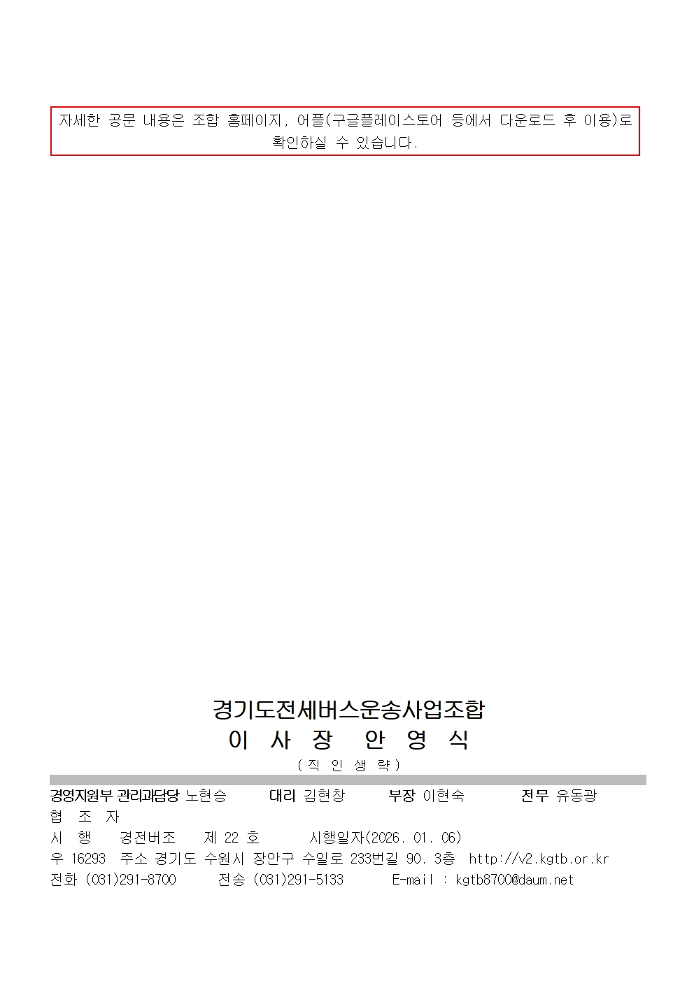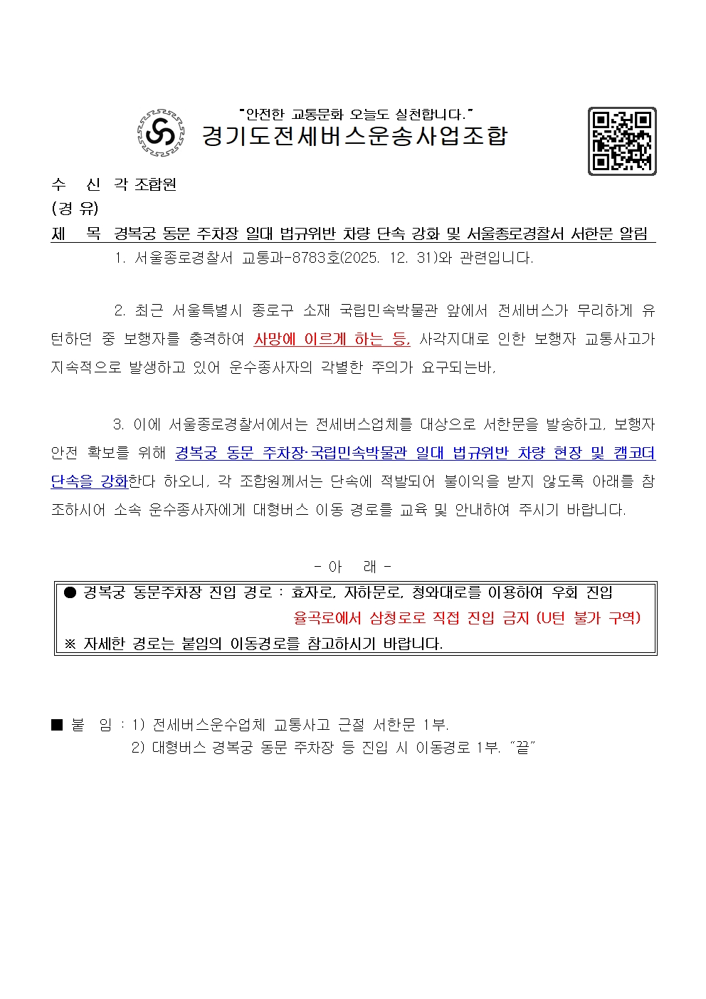 경복궁 동문 주차장 일대 법규위반 차량 단속 강화 및 서울종로경찰서 서한문 알림 페이지 정보 작성자 운영자 조회 605회 작성일 2026-01-06 09:17:29 목록 본문 다운로드 : 경복궁 동문 주차장 일대 법규위반 차량 단속 강화 및 서울종로경찰서 서한문 알림.pdf 다운로드 : 경복궁 동문 주차장 일대 법규위반 차량 단속 강화 및 서울종로경찰서 서한문 알림.hwpx 이전글2025년도 12월 운수종사자 휴식시간 보장내역 제출 및 준수 철저 2026-01-02 다음글고용·산재보험 토탈서비스 관리번호 제출 요청 2026-01-09
