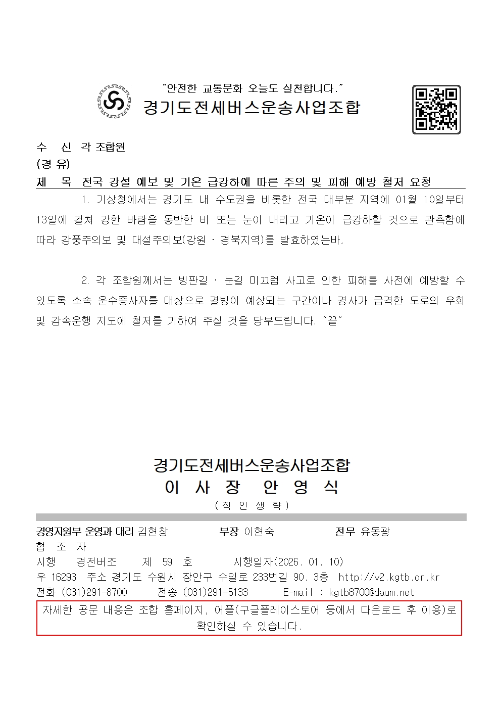 전국 강설 예보 및 기온 급강하에 따른 주의 및 피해 예방 철저 요청 페이지 정보 작성자 운영자 조회 184회 작성일 2026-01-10 11:45:03 목록 본문 다운로드 : 전국 강설 예보 및 기온 급강하에 따른 주의 및 피해 예방 철저 요청.pdf 다운로드 : 전국 강설 예보 및 기온 급강하에 따른 주의 및 피해 예방 철저 요청.hwp 이전글고용·산재보험 토탈서비스 관리번호 제출 요청 2026-01-09 다음글2026년도 사회복무요원 교육생 수송차량 운송용역 입찰 참여 알림 2026-01-14
