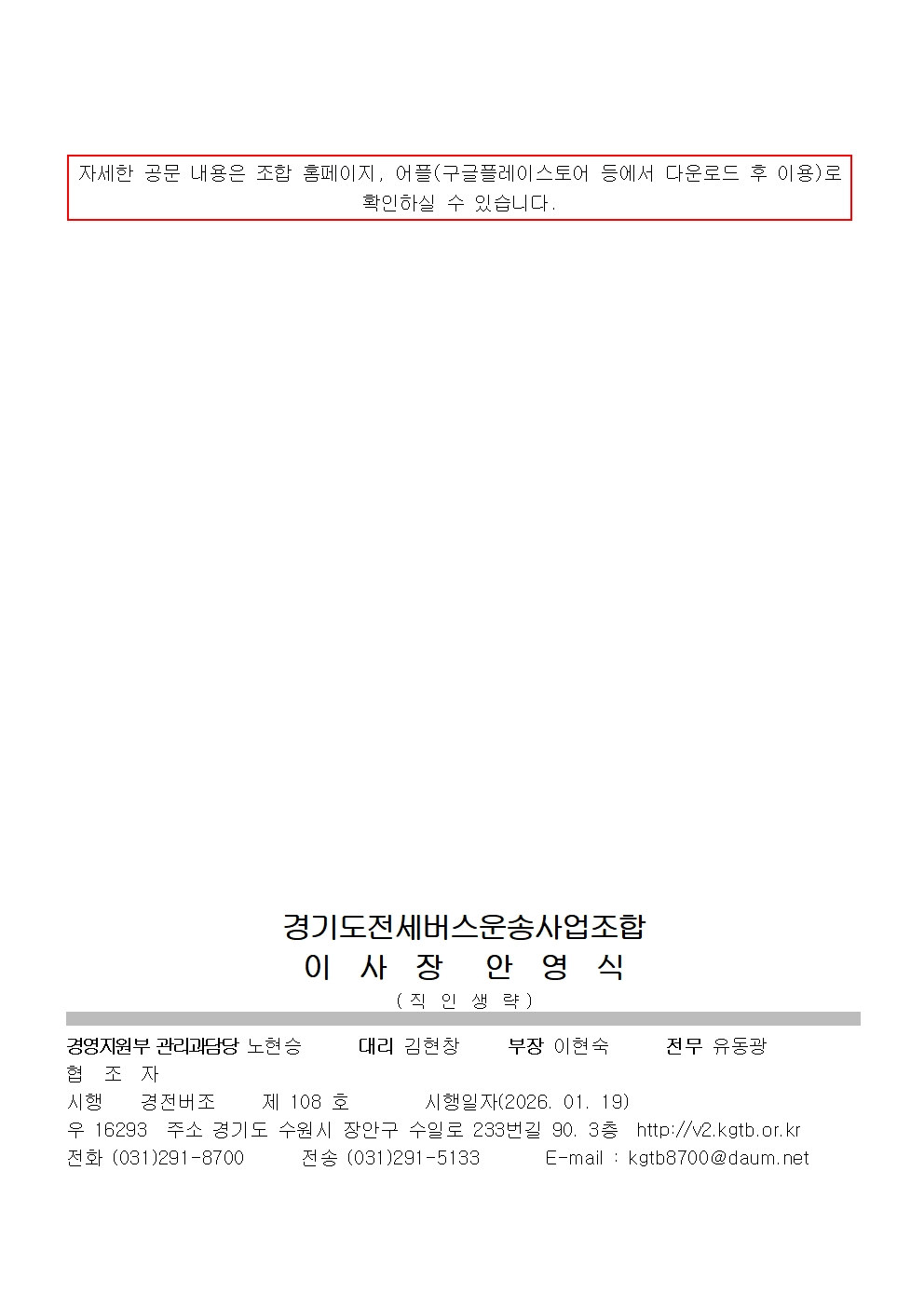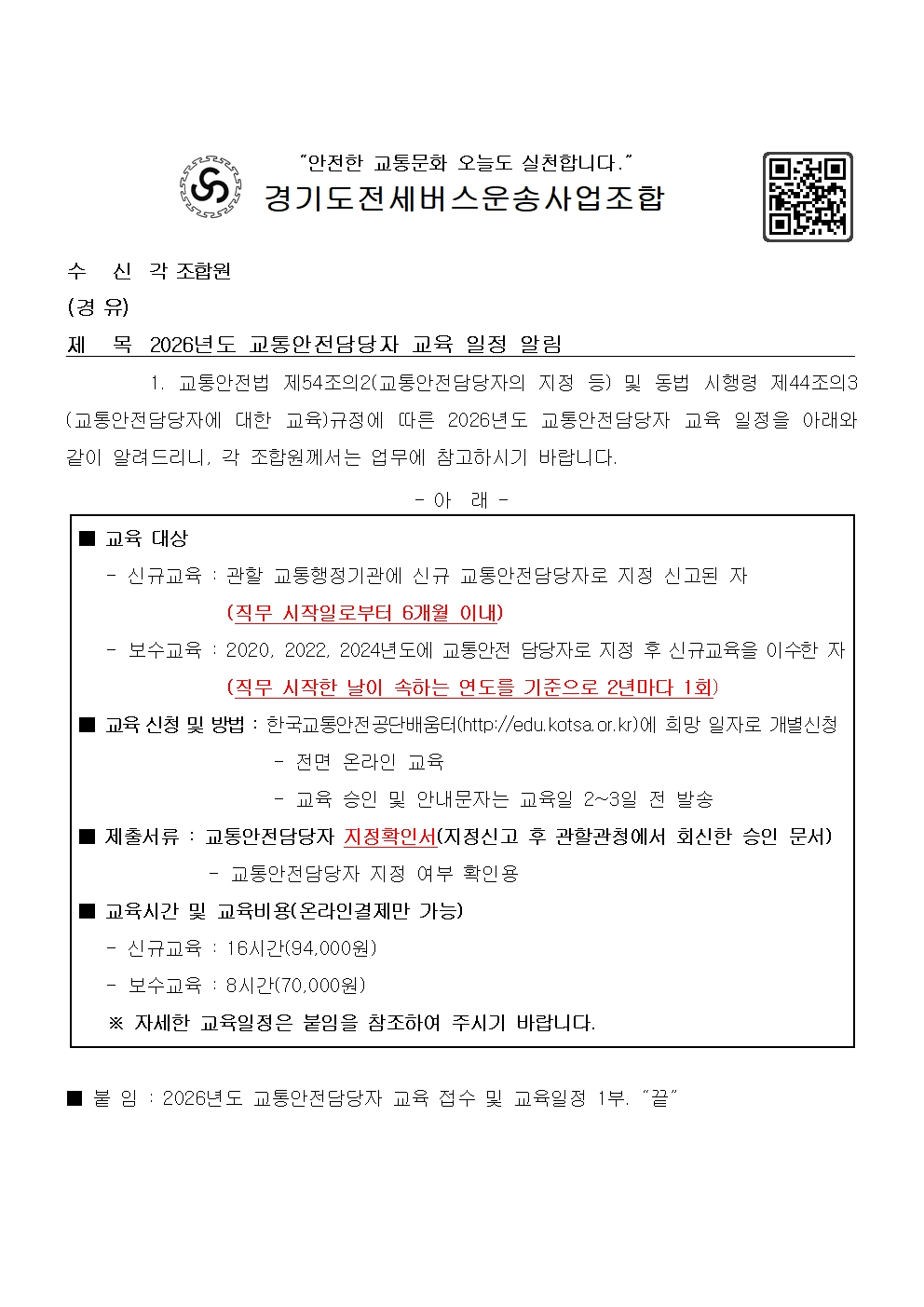 2026년도 교통안전담당자 교육 일정 알림 페이지 정보 작성자 운영자 조회 604회 작성일 2026-01-19 12:46:02 목록 본문 다운로드 : 2026년도 교통안전담당자 교육 일정 알림.pdf 다운로드 : 2026년도 교통안전담당자 교육 일정 알림.hwp 이전글2026년도 사회복무요원 교육생 수송차량 운송용역 입찰 참여 알림 2026-01-14 다음글2025년도 하반기 전세버스 교통안전정보 공시 시행 알림 2026-01-20