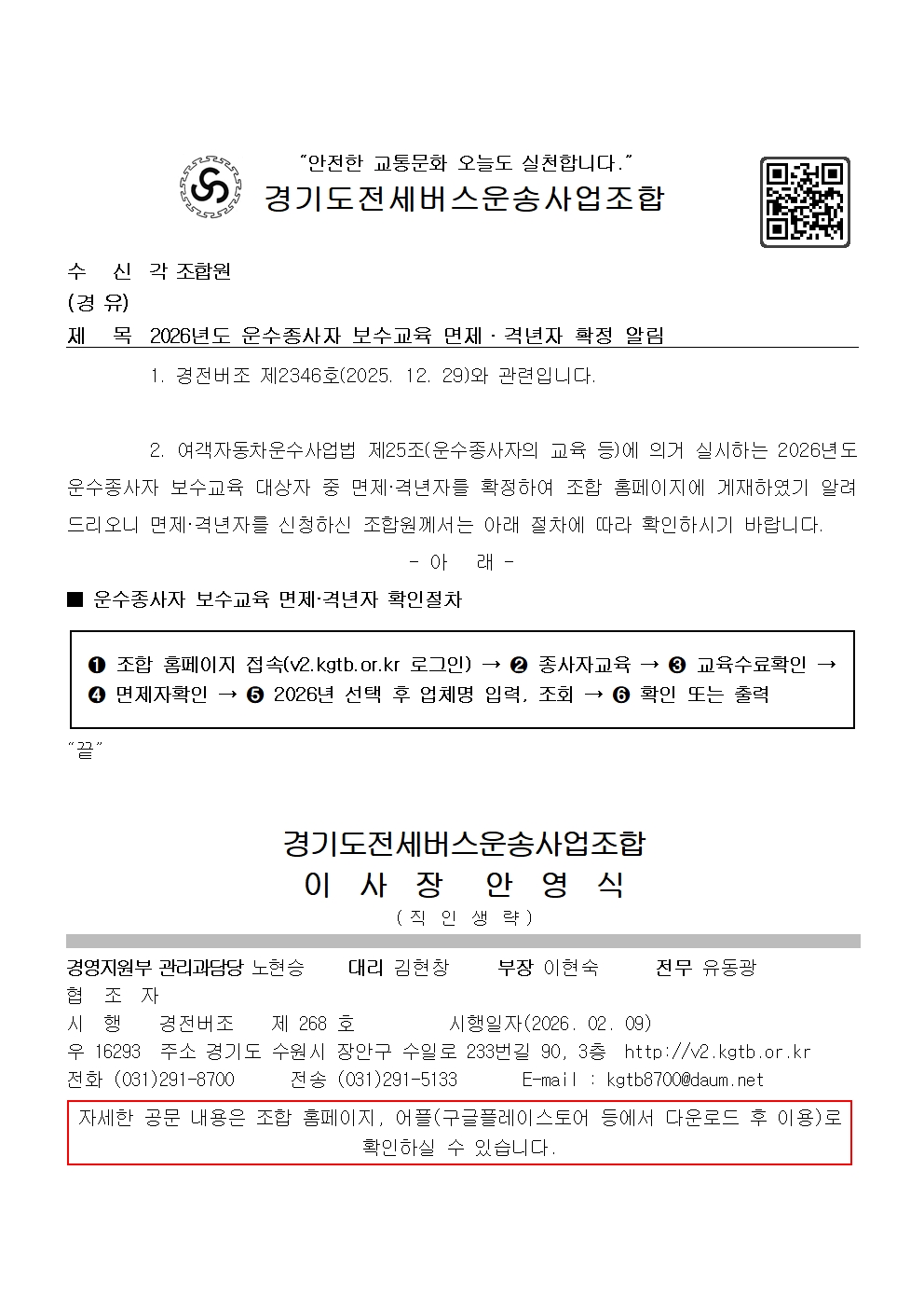 2026년도 운수종사자 보수교육 면제·격년자 확정 알림 페이지 정보 작성자 운영자 조회 785회 작성일 2026-02-09 12:29:58 목록 본문 다운로드 : 2026년도 운수종사자 보수교육 면제·격년자 확정 알림.pdf 다운로드 : 2026년도 운수종사자 보수교육 면제·격년자 확정 알림.hwp 이전글제35회 정기총회 결의사항 알림 2026-02-06 다음글제35회 정기총회 관련 서류 송부 알림 2026-02-19